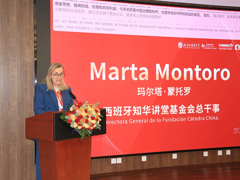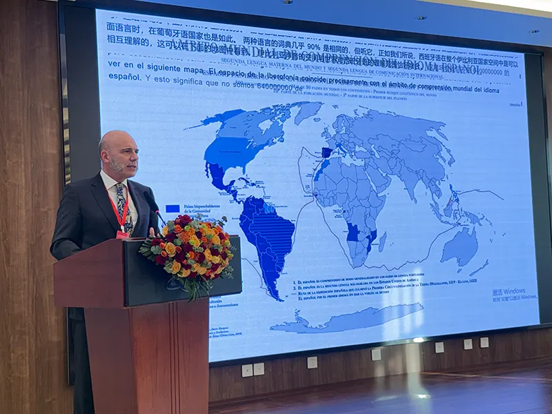 FUNIBER 机构关系主任弗里吉亚诺·阿尔瓦罗·杜兰特斯·普拉多斯博士(Dr. Frigdiano Álvaro Durántez Prados)在发言中进一步阐述了 FUNIBER 主席的观点,强调有必要加强泛伊比利亚(Panibérico)或伊比利亚语系空间与中国之间的协同合作,以推动更加公平、更加均衡的全球化进程。在此背景下,他提出应将西班牙语作为中国外交对外投射的战略性工具,它能够在以英语为主导的全球化格局之外,为中国提供替代性的国际沟通渠道。
