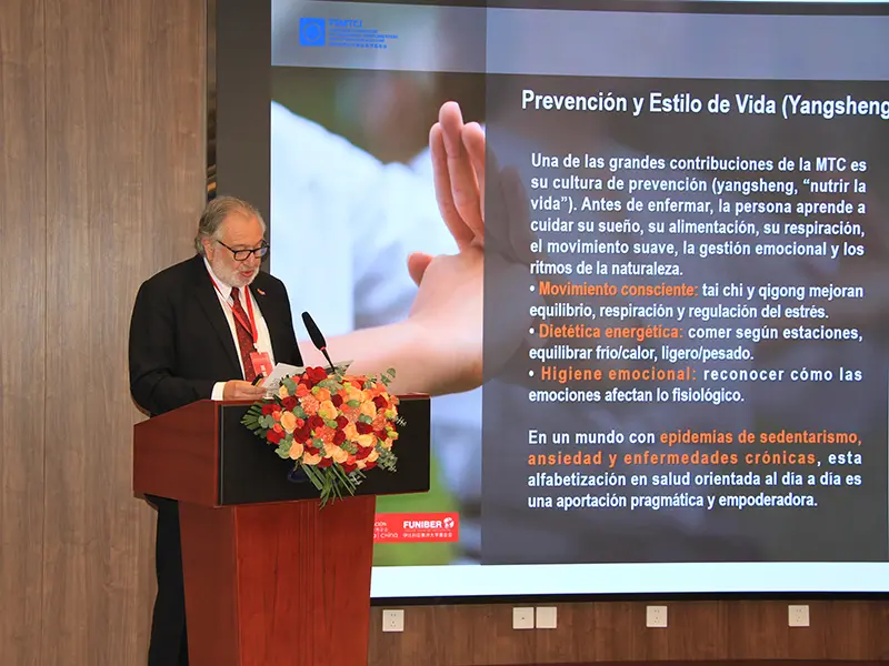 知华讲堂基金会执行副主席、欧洲传统与整合医学基金会主席(大西洋欧洲大学合作机构)拉蒙·卡尔杜奇博士(Dr. Ramón Calduch)强调了中医药的发展、其重要意义及其国际化进程。他引用习近平主席的话:“中医药是中国献给人类的礼物”,指出这一医学体系不仅具有文化价值,也在全球卫生领域发挥着重要作用,并已成为连接东西方的一座理解之桥,因其提供了整体性的健康理念。